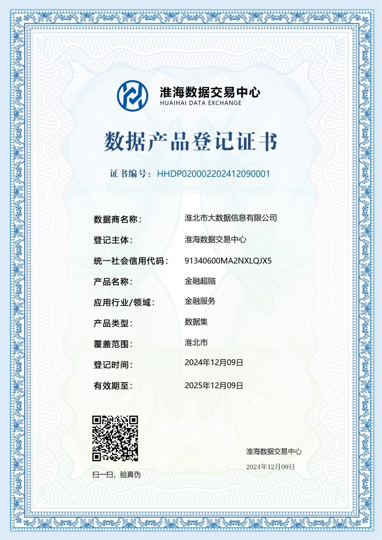 淮海數(shù)據(jù)交易中心作為淮海經(jīng)濟(jì)區(qū)數(shù)據(jù)交易的關(guān)鍵樞紐與創(chuàng)新高地,在數(shù)據(jù)交易規(guī)則制定、數(shù)據(jù)產(chǎn)品創(chuàng)新孵化、數(shù)據(jù)安全保障機(jī)制以及數(shù)據(jù)要素市場培育等多方面均積累了豐富且前沿的經(jīng)驗(yàn)與實(shí)踐成果。淮北市大數(shù)據(jù)信息有限公司積極和淮海數(shù)據(jù)交易中心對(duì)接,深入學(xué)習(xí)與交流,探索數(shù)據(jù)領(lǐng)域發(fā)展新路徑與新機(jī)遇,拓展數(shù)據(jù)要素流通市場,分析探討數(shù)商合作生態(tài),近日該公司數(shù)據(jù)助貸產(chǎn)品“金融超腦”通過淮海數(shù)據(jù)交易中心的認(rèn)證,獲得數(shù)據(jù)產(chǎn)品登記以及數(shù)據(jù)商資格。