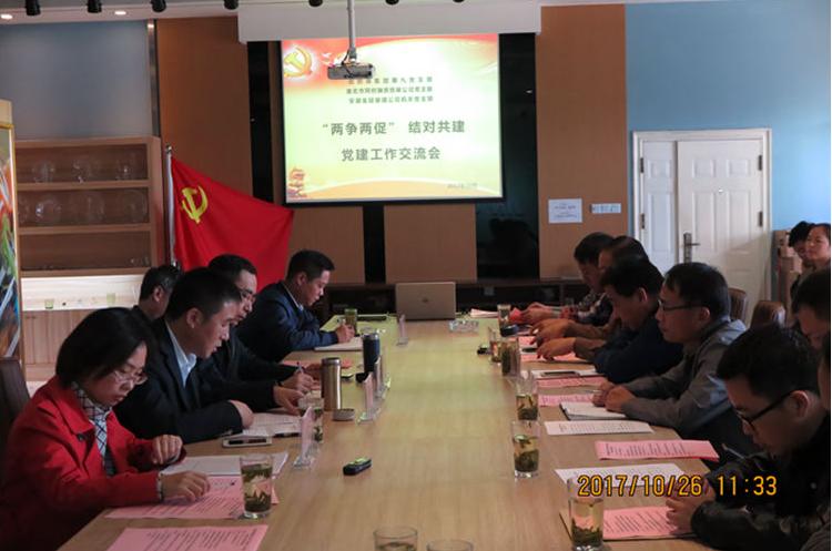 10月26日,同創(chuàng)融資擔(dān)保黨支部與安徽省信用擔(dān)保集團(tuán)有限公司第九黨支部及安徽省金冠玻璃有限責(zé)任公司機(jī)關(guān)黨支部,在安徽省金冠玻璃有限責(zé)任公司黨員活動室開展“兩爭兩促”,結(jié)對共建黨建工作交流活動。