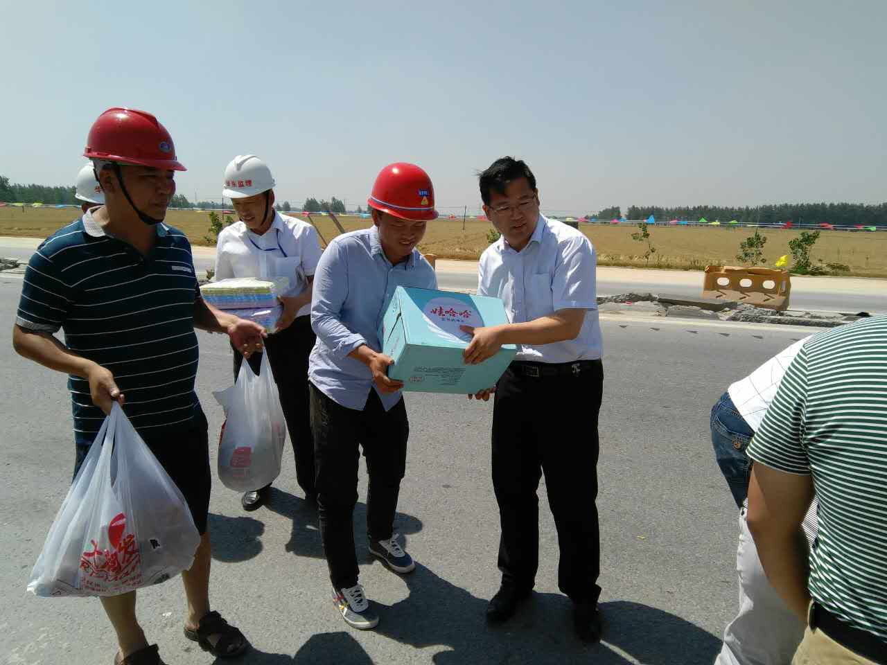驕陽似火,酷暑難耐。為感謝激勵奮斗在烈日中的一線員工,2017年5月27日,集團黨委委員、副總經(jīng)理、交投公司總經(jīng)理張立哲帶領交投公司黨支部一行先后走訪S202收費站項目部和高樓山石料廠項目部門,看望慰問堅守在高溫烈日下的一線員工。