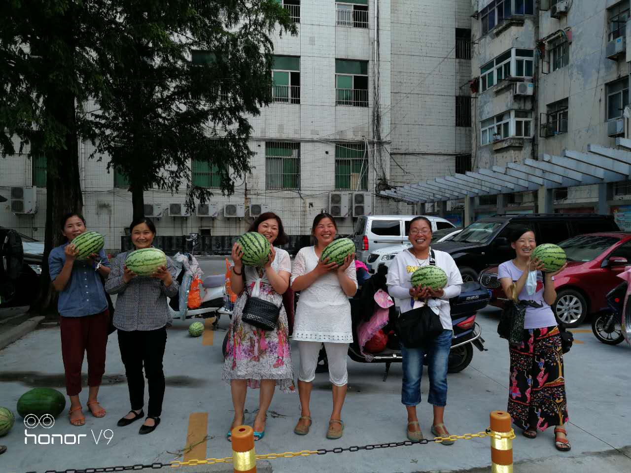 8月8日,城泊公司收費(fèi)員在結(jié)束了一天辛勤的工作后,抱著一個(gè)個(gè)大西瓜露出燦爛的笑容。