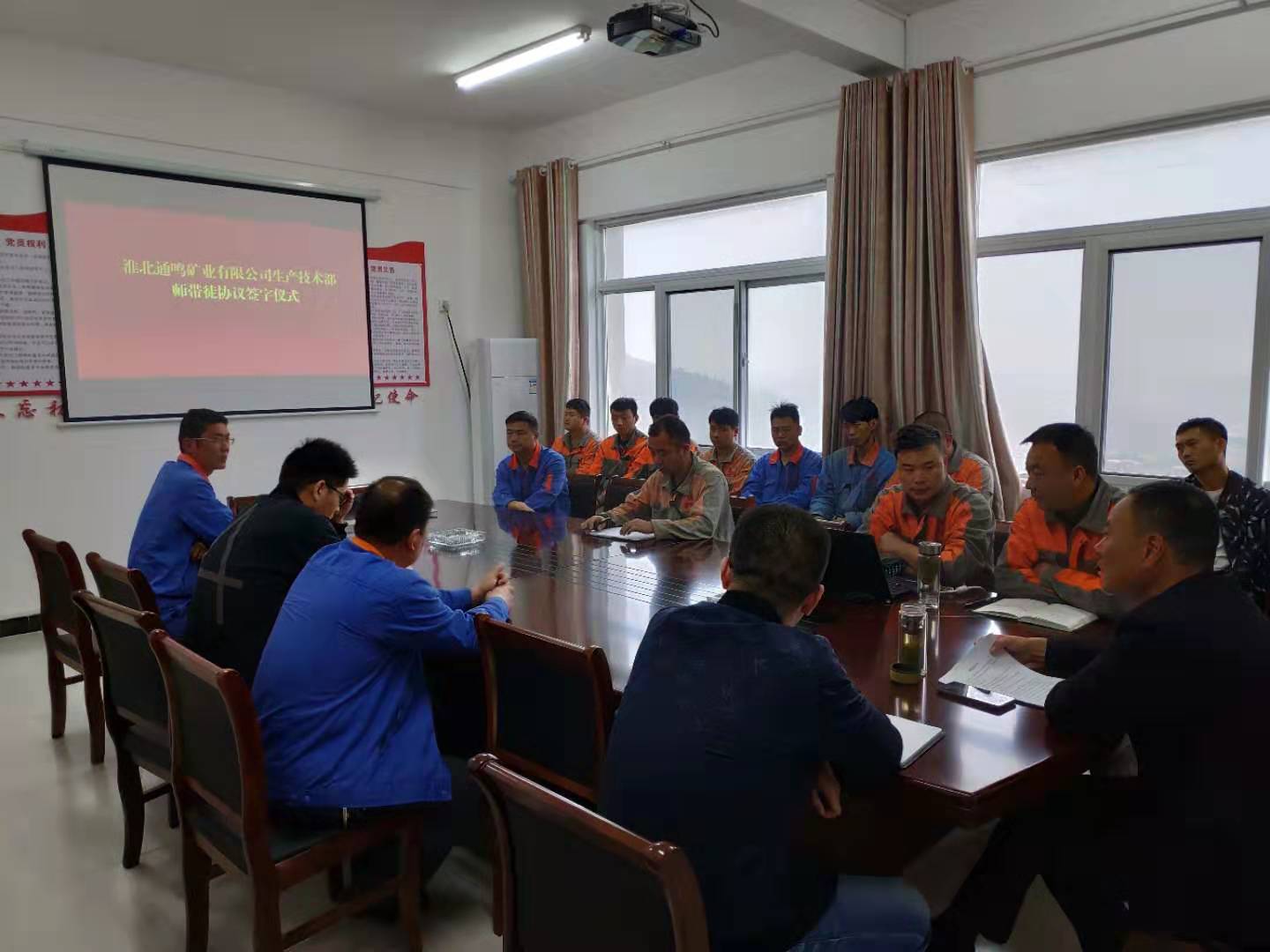 為提高通鳴礦業(yè)員工專業(yè)技術水平和業(yè)務技能,發(fā)揮骨干員工在技術和經(jīng)驗方面的優(yōu)勢,2019年10月10日上午10時,通鳴礦業(yè)總經(jīng)理程南華、副總經(jīng)理張震、毛鴻顯及各部門負責人、生產(chǎn)技術部機電維修班全體員工在通鳴礦業(yè)三樓會議室開展師帶徒活動。